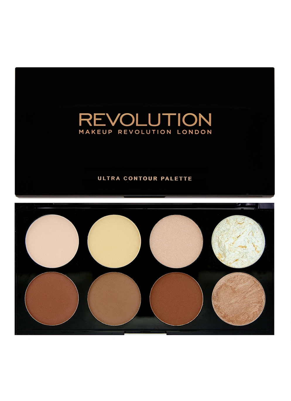 Уникальная палетка средств для идеального контуринга: Revolution Ultra Contour Palette. Здесь вы найдете целых восемь оттенков компактных продуктов для коррекции лица. Среди них шесть пудр для коррекции, 1 запеченный хайлайтер и 1 запеченный бронзер. Стильный футляр оснащен большим зеркалом для удобства нанесения косметических средств. Палетка Makeup Revolution Ultra Contour Palette — это надежный помощник, чтобы всегда выглядеть безупречно!Способ применения: или пользоваться каждым цветом в отдельности. Покройте проблемные зоны темной пудрой, чтобы добиться идеального цвета лица и придать образу завершенность. Затем нанесите хайлайтер, например, на скулы и вдоль переносицы. Совет: скорректировать большое количество темного нюанса можно, если нанести поверх светлый оттенок. Переходы следует хорошо растушевать.